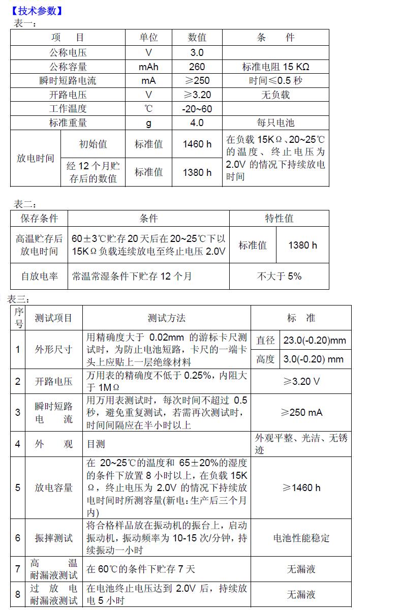 標(biāo)稱電壓:3.0V 尺 寸:23.0*5.4(mm) 標(biāo)稱容量:550mAh 標(biāo)稱電流:0.4mA 最大連續(xù)電流:3.0mA 最大脈沖電流:20.0mA 重 量:6.3g