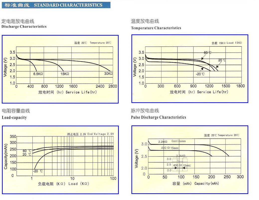 標(biāo)稱電壓:3.0V 尺 寸:23.0*3.5(mm) 標(biāo)稱容量:300mAh 標(biāo)稱電流:0.4mA 最大連續(xù)電流:3.0mA 最大脈沖電流:20.0mA 重 量:4.2g